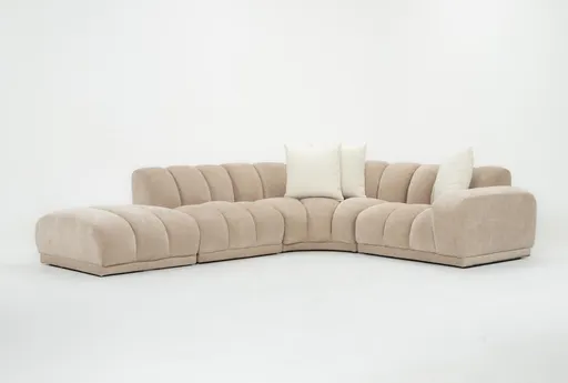 Blossom Modular Rose 124" 4 Piece Sectional With Right Arm Facing Chair is a modern, curved four-piece sectional upholstered in beige 100% polyester with channel tufting and deep, supportive cushions. The modular layout and low-profile platform let you arrange a roomy L-shaped seating group that anchors living rooms and open-plan spaces while the right-facing chair defines a cozy conversation or media area. Deep-seated foam cushions offer supportive, relaxing seating for movie nights and casual entertaining. Curved, channel-tufted silhouette and low-profile platform create a contemporary, inviting focal point without overwhelming a room. Four-piece modular setup adapts to your space and the polyester upholstery is easy to care for; professional cleaning is recommended for long-term upkeep.