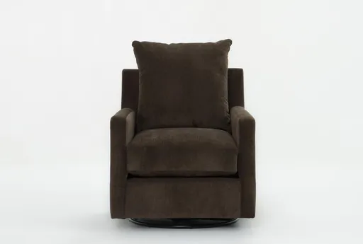 Bonaterra II Chocolate 29.5" Swivel Glider Armchair is a casual, compact armchair upholstered in chocolate polyester chenille that fits cozy corners, nurseries, and living rooms. It offers a medium cushioned seat and supportive back for reading or late-night feedings, while the track arms keep a clean, boxy silhouette. The smooth swivel glider motion and high performance fabric make this chair easy to live with—spot clean for quick upkeep and enjoy the included accent pillow for extra comfort.