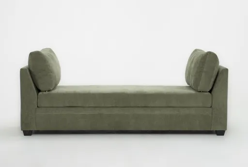Upholstery: Forest green fabric with bolsters for subtle texture and visual depth.