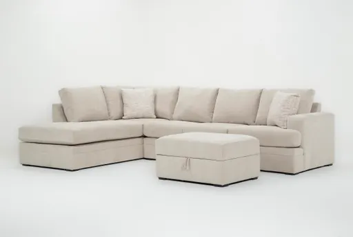 Bonaterra II Sand 127" 2 Piece Sectional With Right Arm Facing Sleeper Sofa + Left Arm Facing Corner Chaise & Ottoman brings relaxed, casual seating to the living room with a spacious chaise and a queen-size sleeper that makes hosting simple. Upholstered in 100% polyester fabric with a chenille texture, it balances a soft hand with everyday durability while medium comfort cushions offer supportive lounging. The two-piece layout and included ottoman let you arrange seating to suit your space and routine.