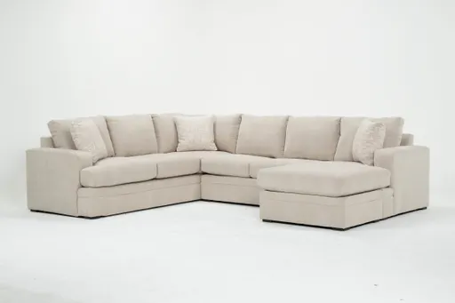 Bonaterra II Sand 127" 2 Piece Sectional With Right Arm Facing Sofa Chaise anchors a casual living room with a neutral sand palette and a relaxed, boxy silhouette that reads as modern living room furniture. Upholstered in soft chenille fabric blended with polyester, this oversized, deep-seated sectional features loose back cushions and supportive box seat cushions with dacron wrapped foam and a coil seating system to deliver a balanced medium comfort level. Track arms and a low platform block base create a clean, minimalist profile while reinforced frame elements provide structural integrity for everyday use. The right facing chaise includes a discreet storage compartment to keep throws and media accessories organized, making the modular seating both practical and inviting for family rooms and media spaces. Because the sectional is a two-piece modular arrangement, it adapts to a range of room sizes and can act as a small space solution in open-plan areas when you need anchor seating without visual clutter. Durable upholstery and an easy-care surface resist daily wear while keeping a soft, cushioned feel that encourages lounging and relaxed conversation. Regular light maintenance like vacuuming and spot cleaning helps preserve the textured fabric and keeps the piece looking fresh for years of everyday living.