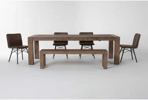 The Bonham extendable dining set blends industrial form with warm acacia tones for a commanding, family-size modern dining table that adapts to every gathering. A beveled edge tabletop combines acacia and veneer with metal accents and rests on a block base for a substantial silhouette. The 79 to 98 inch extension leaf lets the table expand seamlessly to seat extra guests, while the included bench and armless chairs keep sightlines open for a clean dining room look. Faux leather seats provide durable upholstery that wipes clean and stands up to daily use.