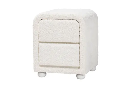 The Bonilla White Teddy-Bear Fabric And Rubberwood 2-Drawer Nightstand brings a cozy modern touch to the bedroom with its soft teddy-bear upholstery and rounded profile. Upholstered in Teddy Bear fabric (100% polyester) with polyurethane foam padding, it offers a plush feel while rubberwood legs and plywood/mdf drawer boxes provide everyday stability. Two roomy drawers keep bedside essentials organized and the compact freestanding footprint fits easily beside most beds.