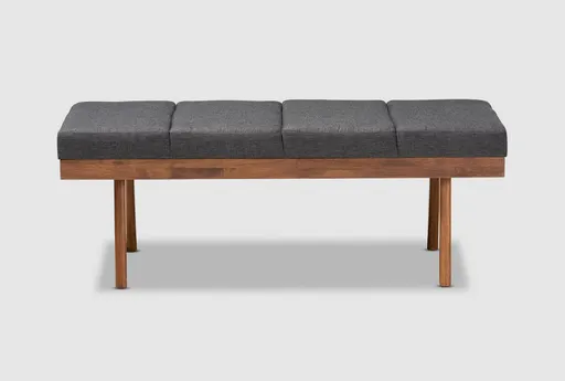 The Boudica Charcoal Fabric Upholstered Wood Bench brings mid-century modern lines and a restrained profile to modern living room furniture with a focus on clean, minimal form. An armless, backless seat topped with channel tufting creates tactile interest while keeping visual weight low, and the charcoal fabric upholstery pairs a neutral palette with a supportive medium-firm cushion. Solid wood legs in a medium brown finish form a block base that lends natural warmth and stable support.