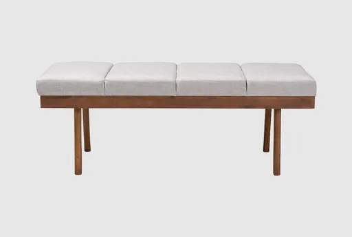 The Boudica bench brings modern minimalism and mid-century charm to small spaces with a clean, backless silhouette. Upholstered in a soft beige polyester-blend fabric with channel tufting, the seat offers tactile interest and a tailored look that complements modern living room furniture and entryway decor. Dacron wrapped foam gives medium-firm support so the bench feels comfortable for sitting while resisting early sagging. A wood frame with tapered legs in a warm brown finish keeps the profile light and stable, making this piece a versatile accent for apartments, dorms, and bedrooms.