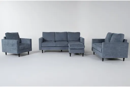 Enhance your living room with the Bradley Denim Blue Fabric Modern 3 Piece Sofa with Reversible Chaise Loveseat & Arm Chair Set. Featuring a sleek, modern design and upholstered in luxurious Europa Denim, this set is perfect for adding a touch of contemporary style to your space. The reversible chaise offers versatility and comfort, making it an ideal choice for your family room or living area.