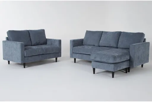 Enhance your living space with the Bradley Denim Blue Fabric Modern 2 Piece Sofa with Reversible Chaise & Loveseat Set. This modern set is designed with comfort and versatility in mind, featuring a sofa and loveseat that are perfect for any living room. The Europa Denim color adds a sophisticated touch, while the 100% polyester fabric ensures durability and easy maintenance.