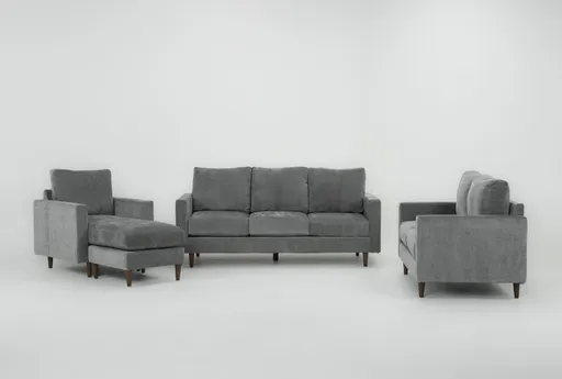 The Bradley II Charcoal Sofa Loveseat & Chaise Set brings modern, livable style to the living room with a coordinated sofa, loveseat and chaise in charcoal upholstery. Upholstered in 100% polyester fabric with chenille accents, the set features medium-firm seating and supportive cushions that hold their shape for everyday use. Tailored track arms and tapered legs create clean lines that make arranging this set around a coffee table or media wall simple and stylish.
