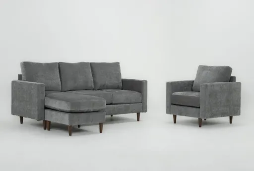 Bradley II Charcoal Sofa with Reversible Chaise & Chair Set brings modern style and practical comfort to your living room. Upholstered in charcoal grey 100% polyester fabric with chenille accents, it pairs tailored lines with medium-firm seat cushions and supportive back cushions for a clean, relaxed look. The reversible chaise adapts to different layouts and the included chair gives you flexible seating for conversation or movie nights.