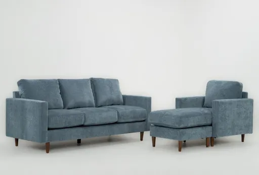 The Bradley II Denim Sofa & Chaise Set brings relaxed modern style to your living room with clean lines, slim arms, and a roomy chaise for stretching out. Upholstered in 100% polyester fabric with chenille accents, the set offers a soft, textured feel while medium firm cushions provide supportive comfort for daily use. Tapered wood legs and tailored cushions give a polished look that pairs effortlessly with patterned pillows or a cozy throw.