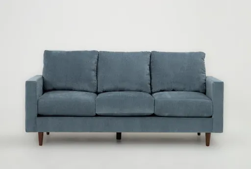 Bradley II Denim 81" Sofa brings modern lines and everyday comfort to the living room, offering a roomy 81-inch seating area that fits apartments and larger family spaces. Upholstered in 100% polyester fabric with chenille back cushions, it delivers medium firm support that keeps you comfortable for conversation and lounging. Slim track arms and tapered wood legs form a grounded, on-trend silhouette that layers easily with rugs and throw pillows.