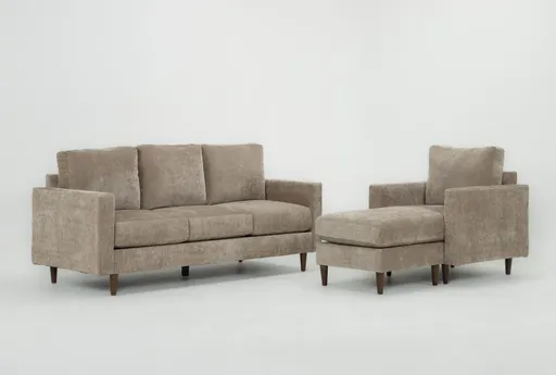 Bradley II Khaki Sofa & Chaise Set brings modern form and approachable comfort to your living room. Upholstered in khaki chenille fabric with 100% polyester content, it offers a soft hand and everyday durability. The chaise creates a lounge-ready spot for reading or stretching out, while the medium firm seat gives reliable support for sitting and reclining. Tapered legs lift the profile so the set feels light in the room and pairs easily with rugs and tables.