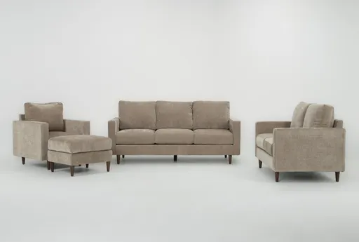 Bradley II Khaki Sofa Loveseat Chair & Ottoman Set brings modern style to the living room with a clean silhouette and comfortable, everyday performance. Upholstered in soft chenille with 100% polyester yarn, the set presents warm brown tones that pair easily with neutrals or accent colors. Medium-firm seat cushions and supportive back cushions deliver balanced comfort for lounging or conversation, while a single track arm and slim metal legs keep the profile light and easy to maintain.