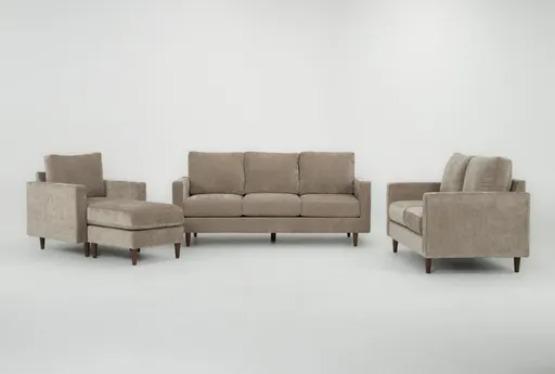 Bradley II Khaki Sofa Loveseat & Chaise Set brings modern lines and comfortable seating to your living room. Upholstered in khaki 100% polyester chenille fabric, the set offers a softly textured look that wears well for everyday life. Medium-firm cushions provide supportive seating for conversation or lounging, while the sofa, loveseat and chaise are proportioned to fit both open-plan and smaller spaces with a low-profile presence.