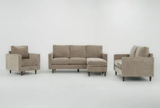 The Bradley II Khaki Sofa with Reversible Chaise Loveseat & Chair Set brings a coordinated three-piece seating group to your living room with a modern silhouette that reads fresh and approachable. Upholstered in 100% polyester fabric with chenille accents, the medium-firm cushions deliver supportive comfort for everyday lounging and visiting with friends. The reversible chaise lets you switch the layout to suit your space, so arranging the room is easy whether you’re hosting movie night or creating a cozy reading nook. Versatile reversible chaise adapts to left or right layouts for flexible room planning. Comfortable medium-firm cushions offer balanced support for sitting and relaxing. Durable polyester fabric with chenille accents resists wear and keeps the set looking pulled together.