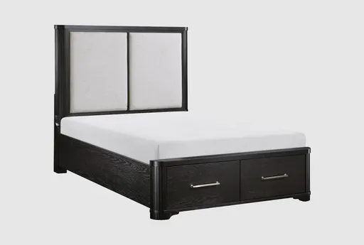 The Brekken Black Queen Platform Storage Bed brings modern design and clever organization to the bedroom. A black matte finish highlights poplar accents and a padded polyester upholstered headboard, while a low-profile platform and symmetrical panel silhouette support a clean, minimalist look. This captain-style platform includes two underbed drawers with dovetail drawer joinery for long-lasting function and easy bedroom organization. It is a smart choice for modern bedroom furniture and a small space solution, where durable upholstery and a storage base help reduce clutter.
