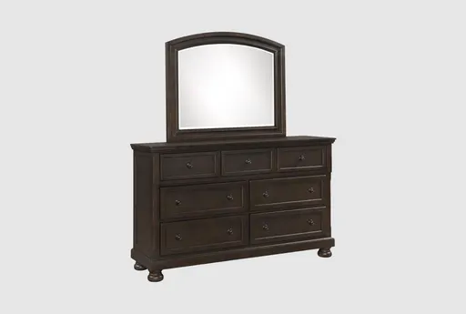 The Brenna 7-Drawer Dresser/Mirror combines casual and traditional styles, making it a versatile addition to any bedroom. Crafted from wood with a grayish brown finish, this dresser offers ample storage with its seven dovetail drawers, including a top center drawer with a felt-lined jewelry tray.