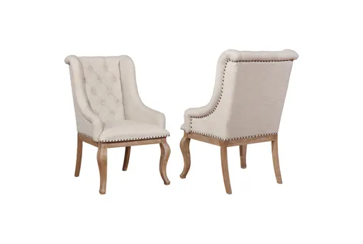Brocky Light Brown Upholstered Armchair Set Of 2 brings classic wingback styling and comfortable everyday seating to living or dining spaces. Each chair is upholstered in ivory fabric with foam padding, a button-tufted back and nailhead trim that create a refined focal point, while oak legs with a textured grain add warm, natural character. An Asian hardwood frame gives reliable support, and the compact curved silhouette works well as a pair beside a sofa or as accent seating in a cozy reading nook.