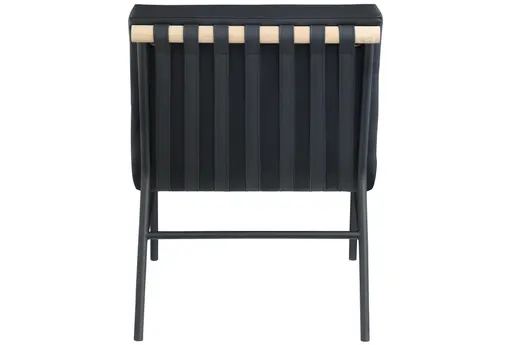 Burke Black Vegan Leather Accent Chair blends modern elegance with studio living comfort. Its sleek silhouette pairs soft black faux vegan leather with striking black straps and a matte black metal frame.