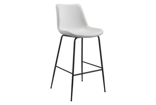 The Byren White 43" Barstool offers a modern touch to your dining room. Its armless design and black leg frame provide a sleek and practical seating option. The curved backrest and footrest ensure comfort during use. Made with 100% polyurethane, plywood, and steel for durability. Features a curved back and footrest for added comfort. Designed with a neutral grey color to complement various interiors.