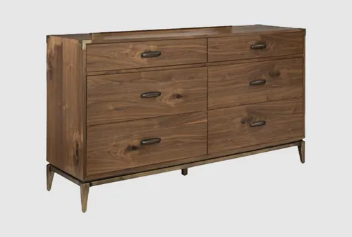 Add a touch of mid-century modern style to your bedroom with the Cade Brown Wood 34" 6 Drawer Dresser. Crafted from natural walnut, this piece combines functionality with a timeless design. Its six spacious drawers provide ample storage for all your belongings, making it a perfect addition to any bedroom.