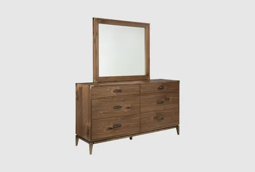 The Cade Brown Wood 6-Drawer Dresser with Mirror | Mahogany is an excellent addition to any bedroom, offering ample storage and a stylish look. Crafted from mahogany, this dresser features six spacious drawers and a convenient mirror. Its mid-century modern design adds a touch of sophistication to your space.