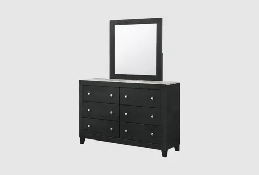 The Cady Black 6-Drawer Dresser with Mirror is a perfect addition to any bedroom. This contemporary dresser features a sleek black finish and includes a matching mirror. With six spacious drawers, this piece provides ample storage for all your essentials.