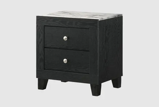 Introducing the Cady Black 23" 2-Drawer Nightstand, a perfect addition to your contemporary bedroom. This sophisticated nightstand features a sleek black finish and a durable paper veneer & MDF construction. Its elegant design is complemented by a beautiful marble top and practical tapered legs.