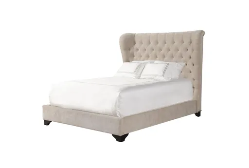 Cailey Beige Queen Upholstered Panel Bed brings a traditional wingback profile and a tall tufted headboard that centers head and neck support while anchoring the room in soft neutral tones. The frame is upholstered in high-performance fabric in a warm beige with pintucked button detail and a gently curved silhouette that reads classic without feeling heavy. A low-profile platform frame with tapered legs provides reliable mattress support and is compatible with most adjustable bases. Polyester fill and foam padding make the headboard inviting for reading in bed or watching TV.