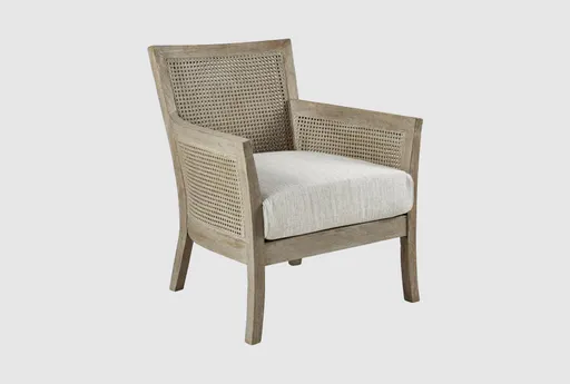 Introducing the Caitlin Natural Beige Fabric/Wood Accent Arm Chair, a perfect blend of rustic charm and modern comfort. This lounge chair features a firm cushion and track arms, providing both style and support. The reclaimed natural wood finish and cream-colored rattan seat and back create a warm, inviting look for any living space.