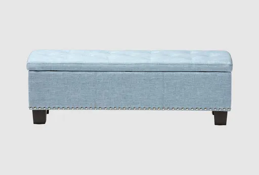 Enhance your bedroom or living room with the Caius Light Blue Fabric Upholstered Button-Tufting Storage Ottoman Bench. This versatile piece provides both functionality and style, offering a convenient storage solution while adding a touch of modern charm to your space.