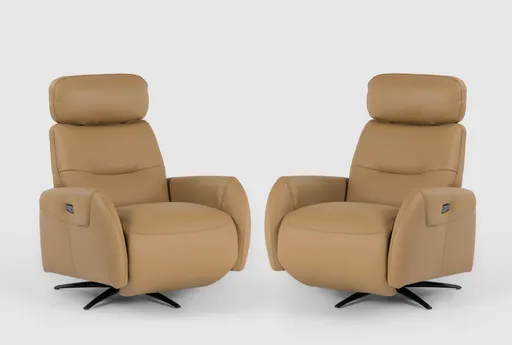 The Caius Saddle Brown Leather 32" Swivel Power Recliner with Manual Adjustable Headrest & Battery & USB Set of 2 brings luxurious comfort to any living room. These recliners offer a stylish pedastal design and come in a soft camel color. Upholstered in top grain leather match, they provide a premium seating experience.