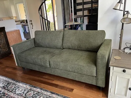 Calais III Green 78" Modern Sofa offers a compact, modern silhouette with clean track arms and a tight back that read as minimal and refined. Upholstered in a durable polyester blend fabric in green, it pairs foam cushions with dacron wrap to deliver supportive seating that stays tidy over time. The slim block arms, tapered wood legs, and symmetrical profile bring a mid-century modern touch while serving as a small space solution for apartments and dorm living.