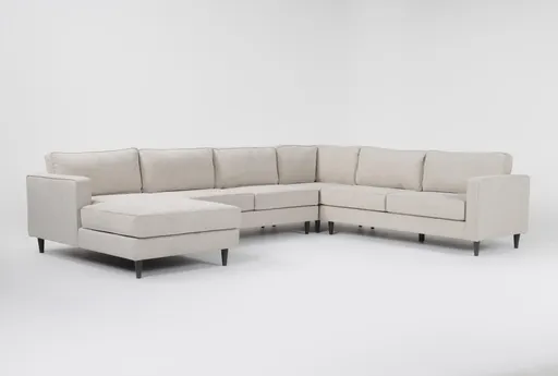 The Calais III Linen 142" 4 Piece Sectional with Left Arm Facing Chaise brings modern style to your living room with its sleek design and comfortable fabric. This sectional features track arms and tapered legs, offering a contemporary look that's perfect for any space. The neutral linen color ensures it will blend seamlessly with any decor.