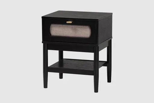 The Calista 1-Drawer Nightstand is a stylish and functional addition to any modern bedroom. Its beige and black color scheme complements a variety of decor styles, while the solid rubberwood and ash veneered MDF construction ensures durability. The padded drawer face, upholstered in a polyester-viscose blend fabric, adds a touch of elegance and comfort.