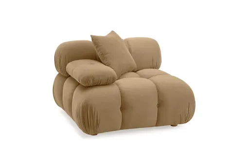 The Calliope Cafe Au Lait Brown Performance Velvet Tufted Modular Corner Chair with Throw Pillow & Removable Arms is a stunning addition to any modern living space. Its rich cafe au lait color and ultra-soft performance velvet upholstery create a luxurious and inviting seating experience. Handmade by skilled artisans, this chair features a pillowy silhouette with a deep hand-tufted design that exudes comfort and style.