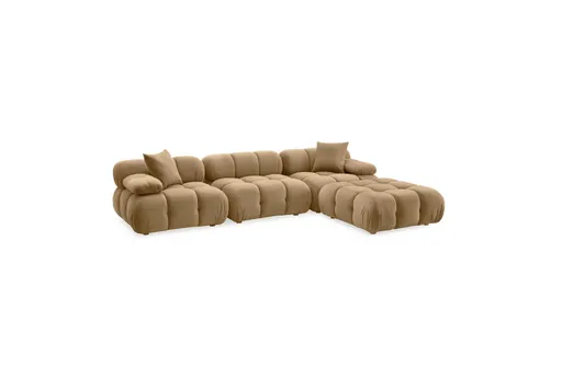The Calliope Cafe Au Lait Brown Performance Velvet Tufted 118" 4 Piece Modular Sectional With 2 Throw Pillows offers luxurious comfort and versatility for your living room. Designed with a modern aesthetic, this sectional is upholstered in high-performance velvet that combines durability with a plush feel. Its reversible orientation allows you to customize the layout to suit your space.