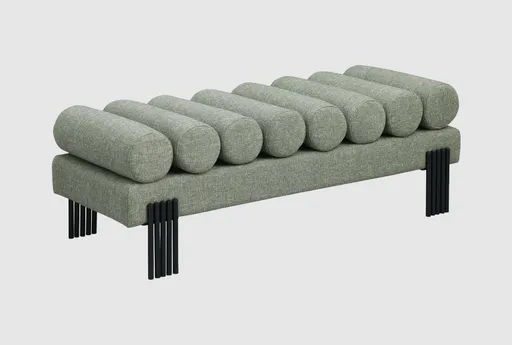 Callista Green Linen Upholstered Bench introduces modern, sculptural seating to an entryway with a row of channel-roll cushions that invite you to sit. Upholstered in linen-textured fabric over foam-filled cushions, the bench balances plush, comfort-forward seating with a low-profile silhouette. The piece pairs an eucalyptus wood frame with iron legs and reinforced joinery for reliable support, making it a versatile choice for entryways, the foot of a bed, or extra seating in a living area.