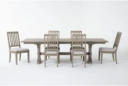 Keep traditional style alive during every meal with our classic Cambria dining set, which brings touches of the past into your present. Stately and sophisticated, the designs feature solid acacia – a material that boasts natural beauty, quality and authenticity. While the dining chair offers upholstered seating for comfort, the extendable double pedestal trestle dining table includes a 12" leaf for grander gatherings.