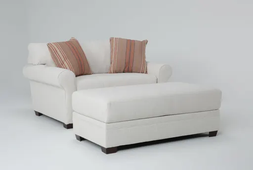 Cameron IV Ivory Fabric Oversized Chair And Ottoman offers comfort with a casual design. This American-made set features ivory upholstery, deep seating, and roll arms for enhanced comfort in this large, comfortable armchair. Ivory/beige high performance fabric. Loose cushion back design for extra comfort. Made in USA craftsmanship. Customizable fabrics at no cost. Spacious dimensions (63"W x 40"H x 44"D) perfect for a big, comfortable armchair.