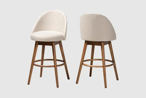 The Canalis Light Beige Fabric Upholstered + Walnut-Finished Wood Swivel Barstool Set of 2 is a perfect addition to your dining room or kitchen. These modern barstools feature a comfortable swivel design and are upholstered in soft beige fabric. The walnut-finished rubberwood legs provide a sturdy and stylish foundation.