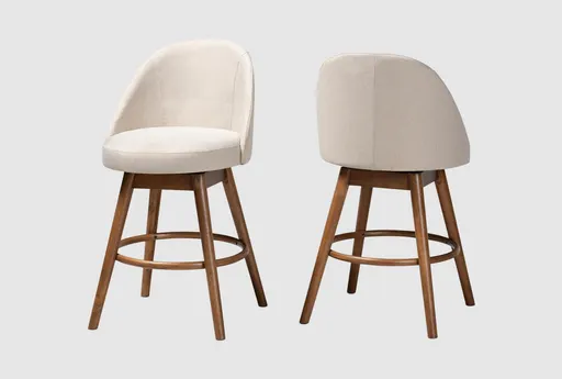 Enhance your dining room or kitchen with the Canalis Light Beige Fabric Upholstered Walnut-Finished Wood Swivel 26" Counter Height Stool Set of 2. These stylish and modern stools are designed to add a touch of comfort and functionality to your space. The armless design and swivel feature make these stools a great addition to any counter height seating area.