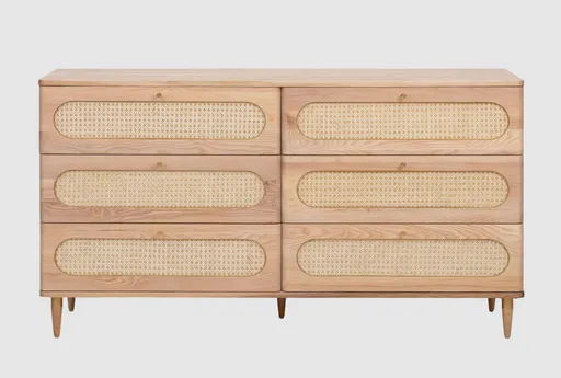 The Canary Cane 6-Drawer Dresser is a boho-style storage solution, handmade by skilled craftsmen using ash wood and rattan. Its natural finish highlights the stunning cane and ash wood, making it a unique addition to any bedroom. Features six spacious drawers for ample storage. Available in two sizes: Queen and King.