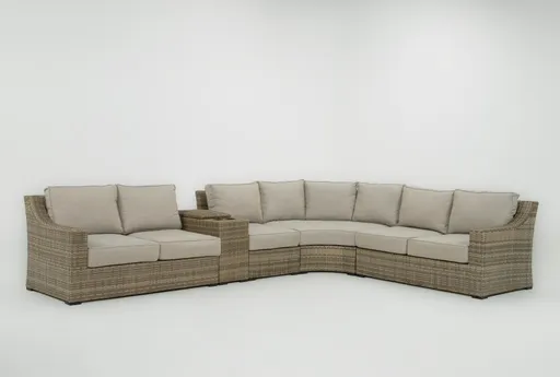 Capri 5 Piece Outdoor Sectional + Console offers casual, patio-ready seating with beige cushions upholstered in Suredura fabric and a wicker and aluminum frame built for outdoor use. The modular five-piece layout includes a center console that provides a tabletop surface for drinks and small items, while removable seat and back cushions make spot cleaning and seasonal storage simple. This set creates a comfortable conversation area for relaxing, entertaining, or lounging on your deck or patio.