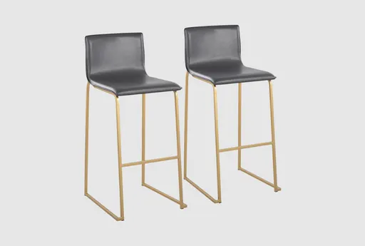 Elevate your dining experience with the Cara Gold Steel and Grey Faux Leather Bar Stool Set of 2, featuring a modern design and luxurious faux leather material. This set of armless stools is perfect for any dining room, providing both comfort and style. Sturdy gold steel frame ensures durability and stability. Sleek grey faux leather upholstery adds a touch of elegance. Armless design allows for easy movement and flexibility.