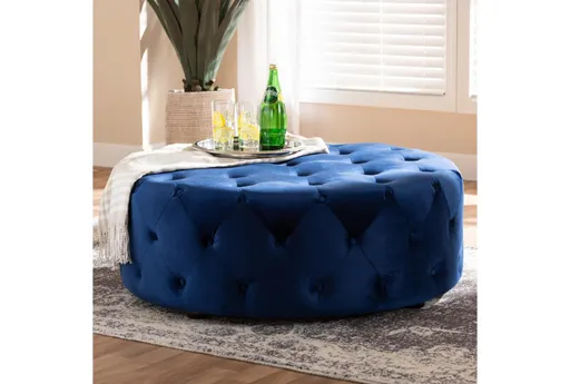 Cardiff Blue Velvet Button Tufted Round Cocktail Ottoman | Furnzy.com - Shop local furniture stores in one place
