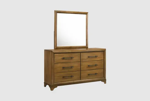 The Carlie Honey Brown Dresser and Mirror Set brings casual, transitional appeal to the bedroom with a warm honey brown finish and clean-lined proportions. Six roomy drawers and a matching rectangular glass mirror create a practical dressing area and generous bedroom storage for folded clothing and linens. The case mixes wood and veneer surfaces to showcase textured grain while metal drawer pulls provide dependable function and a classic silhouette. Bracket feet and a low-profile, boxy shape keep the piece visually light, making it an effective small space solution for apartments and guest rooms.