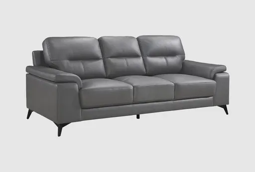 Introducing the Carmel Dark Grey 89" Leather Sofa, a perfect blend of modern style and luxurious comfort. This sofa features a sleek dark grey color and is crafted from 100% top grain leather, ensuring both durability and a sophisticated look. The solid wood and plywood frame, along with exposed metal feet with a black finish, add to its contemporary appeal.