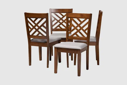 Enhance your dining experience with the Caroline Grey Fabric Upholstered and Walnut Brown Finished Wood Dining Chair Set. These modern chairs feature a stylish combination of grey fabric and walnut brown wood, providing a neutral and timeless look suitable for any dining room. Crafted from fabric, foam, and oak wood, this set of four chairs offers comfort and durability for everyday use.
