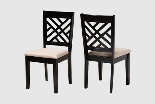 Bring a touch of modern sophistication to your dining area with the Caroline Sand Fabric Upholstered Espresso Brown Finished Wood Dining Chair Set Of 2. These armless chairs feature a stylish latticework back design and a warm sand brown fabric seat that complements the espresso brown finished wood frame. Perfect for dining rooms and kitchens, they offer both comfort and style.